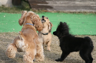 伏せてなでなでしてもらってるチョロマツ君をクンクンしてるレオン君、そして何故かポーズの決まっているエースちゃん