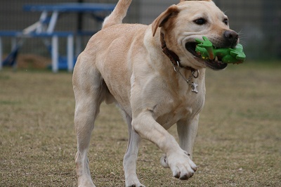 お父さんにかえるを引っ掛けられたラブ君