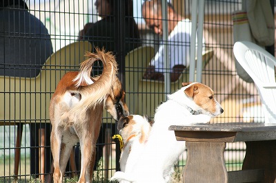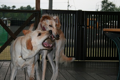 そして外がザーザー雨だろうと関係ないお二人は、デッキで「わーわーぎゃーぎゃー!」っと取っ組み合いをして遊んでました