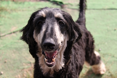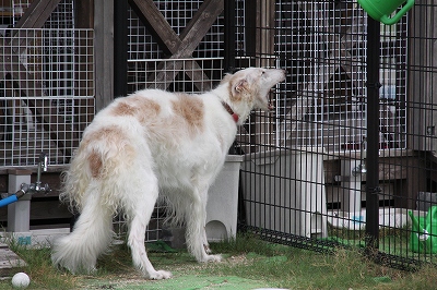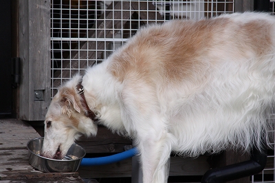 暑くてお水を必死にのんでるグラちゃん、やっぱり小型犬が気になるみたいですね(笑)
