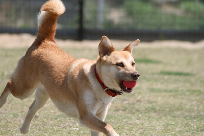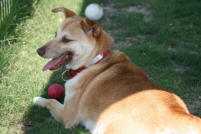 ボールをくわえて離さないあいちゃん