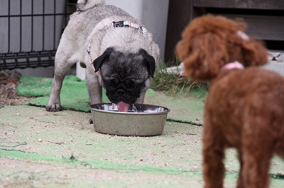 チョコちゃんが遊んでくれるのを待ってますがマイペースに水のみ(笑)