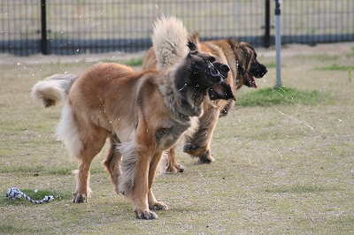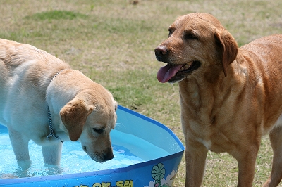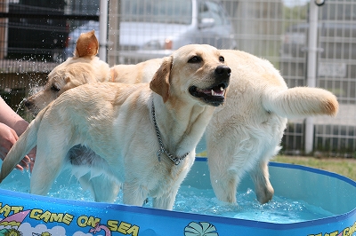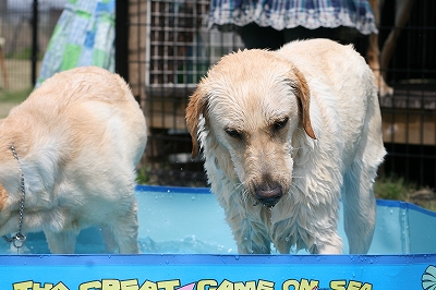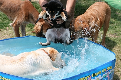 水が嫌いな日向ちゃん、入らず抱っこだけど、そんな水嫌いな日向ちゃんに水しぶきを浴びせるカン太君