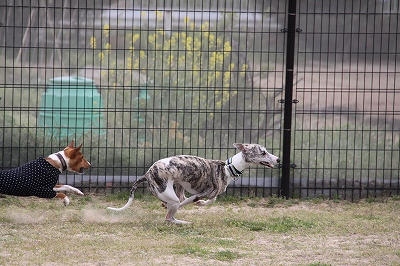 が、フェンスの向こうで走り回るチロ君とチョコちゃんを狙ってるところみたいな(笑)