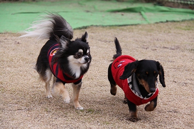 赤い服同士並んで歩いてました
