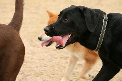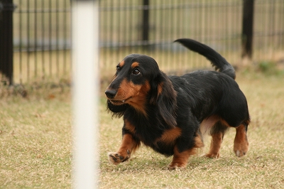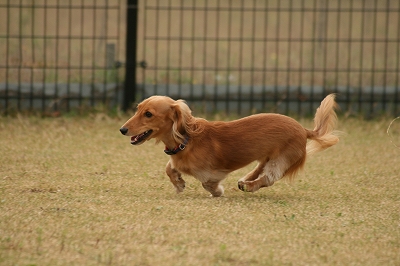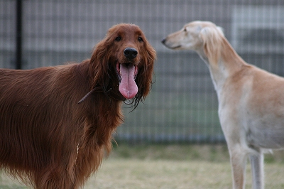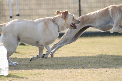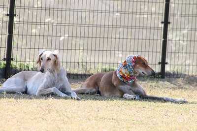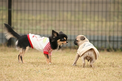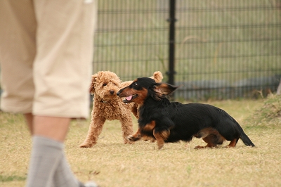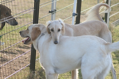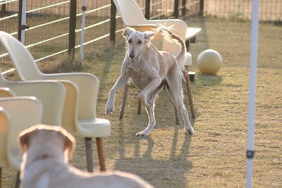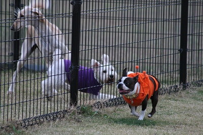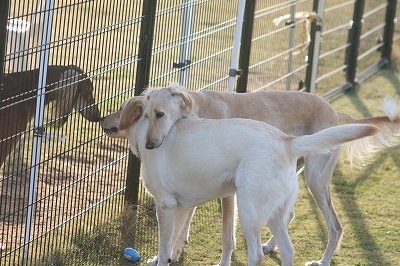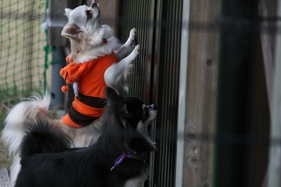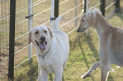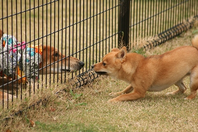 今日もご飯を残さず食べて、自分からダリアを誘ってフェンス越しに走ってました