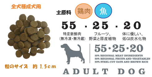 | 全犬種成犬用ドッグフード あらゆる成犬用完全バランスフード(1 歳以上) 標準的な活発さを持つ成犬の食事で留意すべき点は、ベストな体重の維持、消化器官の健康、そして皮膚と毛並みの調整です。 高たんぱく低炭水化物のアカナ アダルトドッグは犬の自然な食事を再現しています。地元草原農場産の放し飼い鶏肉と全卵、バンクーバー島の太平洋サーモンなど最高品質の肉原材料を成分の実に 55%に使用しています。これらの原材料は毎日新鮮なまま(無冷凍・保存料不使用)自社工場に搬送されています。消化不良を引き起こす可能性がある小麦、ライ麦、トウモロコシ、グルテン一切不使用、その代わりとして地元産のフルーツと野菜を使用しています。さらに、単糖(犬の不適切な体重増加の原因となる)量が低い、低GI 炭水化物の蒸しアルバータオーツを使用しています。新鮮サーモンに豊富に含まれるオメガ3(EPA とDHA)が免疫と輝く皮膚と毛並み作りをサポートします。皮膚と毛並みは犬の健康と活力の外見的目安となります。また、オーガニック海藻と草原植物が体内毒素の除去を助けると同時に代謝を増強化する、天然抗酸化剤と植物栄養素を豊富に供給します。 ワールドクラスのアカナはカナダ西部の最高品質の新鮮原材料を使用して、天候のよいカナダのアルバータ州にある家族経営の自社工場(受賞暦あり)で製造されています。原材料を読めばお分かり頂けるでしょう。アカナ アダルトはあなたの成犬がおいしく食べて健康でたくましく幸せに過ごすための自然ペットフードです。 代謝エネルギー4050 kcal/kg (250 ml カップ1 杯につき405 kcal )中36%がたんぱく質、32%が脂肪、32%がフルーツ、野菜、スチールカットオーツ由来です。 |