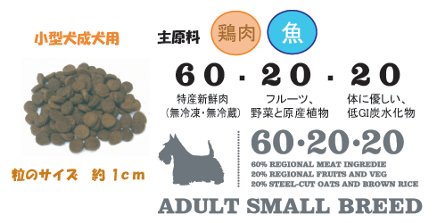 | 小型犬専用の成犬用ドッグフード あらゆる小型犬用完全バランスフード(1 歳以上) 小型犬には、必要な高エネルギーを供給するために、肉含有量が多く高品質のたんぱく質を豊富に含む一方、低炭水化物で体重コントロール出来るように特別配合された食事が最適です。 アカナ アダルト・スモール・ブリードは地元農場産の放し飼い鶏肉と全卵、バンクーバー島の高品質サーモンなどの風味豊かな人間用肉原材料を成分の実に60%に使用しています。これらの原材料は毎日新鮮なまま(無冷凍・保存料不使用)自社工場に搬送されています。高たんぱく低炭水化物、適度な脂肪量のアカナは小型犬の自然な食事を再現しています。食物アレルギーを引き起こす可能性がある小麦、トウモロコシ、グルテン一切不使用、その代わりとして地元産のフルーツと野菜を使用しています。さらに、単糖(血糖値を不安定にして小型犬の不適切な体重過多の原因となる)量が゙低い、健康的な低GI 炭水化物のスチールカットのアルバータオーツを使用しています。 新鮮サーモンに豊富に含まれる必須脂肪酸(EPA とDHA)が輝く皮膚と毛並み作りをサポートします。皮膚と毛並みは犬の活力の外見的目安となります。また、ビロードアオイ、フェンネル、イラ草などの草原植物がセレン、ビタミンB 群、亜鉛、バイオチンを供給、免疫力を強化します。アカナはカナダ西部の最高品質の新鮮原材料を使用して、カナダのアルバータ州にある家族経営の自社工場(受賞暦あり)で製造されています。原材料を読めばお分かり頂けるでしょう。アカナ アダルト・スモール・ブリードはあなたの小型犬がおいしく食べて健康でたくましく過ごすための自然ペットフードです。 代謝エネルギー4150 kcal/kg (250 ml カップ1 杯につき415 kcal )中35%がたんぱく質、35%が脂肪、30%がフルーツ、野菜、スチールカットオーツ由来です。 |