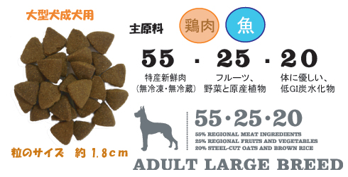 | 大型犬成犬用ドッグフード 大型犬用完全バランスフード 現在のペットフードは低たんぱく高炭水化物の成分構成で血糖値を上げ、体重増加を促します。このため大型犬に多い体重過多と関節の疾患が深刻化してきています。 高たんぱく低炭水化物のアカナ アダルト・ラージ・ブリードは犬の自然な食事を再現しています。地元草原農場産の放し飼い鶏肉と全卵、バンクーバー島の太平洋サーモンなど最高品質の地元産肉原材料を成分の実に55%に使用しています。これらの原材料は毎日新鮮なまま(無冷凍・保存料不使用)自社工場に搬送されています。大型犬の消化疾患を引き起こす可能性がある小麦、トウモロコシ、グルテン一切不使用、その代わりとして地元産のフルーツと野菜を使用しています。さらに、単糖(血糖値を上げ不適切な体重増加の原因となる)量が低く持続性のあるエネルギーを供給する、低GI 炭水化物の蒸しアルバータオーツを使用しています。新鮮太平洋サーモンに豊富に含まれるオメガ3 必須脂肪酸(EPA とDHA)が免疫と輝く皮膚と毛並み作りをサポートします。また、オーガニック海藻と草原植物に含まれる天然抗酸化剤と植物栄養素が代謝をアップします。 ワールドクラスのアカナはカナダ西部の最高品質の新鮮原材料を使用して、天候のよいカナダのアルバータ州にある自社工場(受賞暦あり)で製造されています。原材料を読めばお分かり頂けるでしょう。アカナ アダルト・ラージ・ブリードはあなたの大型犬がおいしく食べて健康でたくましく過ごすための自然ペットフードです。 代謝エネルギー4000 kcal/kg (250 ml カップ1 杯につき385 kcal )中40%がたんぱく質、30%が脂肪、30%がフルーツ、野菜、蒸しオーツ由来です。 |