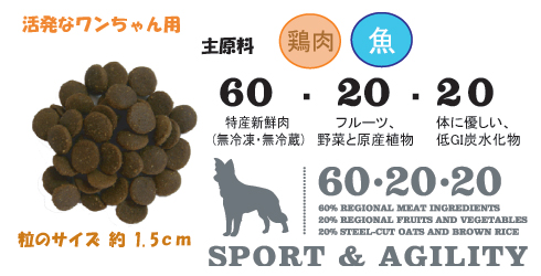 | 全犬種成犬用ドッグフード 大変活発な犬用完全バランスフード(あらゆる種類、年齢) 羊の見張りや障害物競走、あるいはビーチを全力疾走するスポーツ犬は、体力と持久力を維持するために動物性たんぱく質と脂肪を豊富に含む高栄養食を必要とします。 アカナ スポーツ&アジリティは地元草原農場産の新鮮放し飼い鶏肉と全卵、バンクーバー島の太平洋サーモン(EPA とDHA オメガ3 脂肪酸に富む)など最高品質で消化に良い肉と脂肪を成分の実に60%に使用しています。これらの原材料は毎日新鮮なまま(無冷凍・保存料不使用)自社工場に搬送されています。栄養豊かな肉たんぱく質と必須脂肪がひと粒ひと粒にぎっしり詰まったアカナ スポーツ&アジリティは低炭水化物、犬の自然な食事を再現しています。消化疾患を引き起こす可能性がある小麦、トウモロコシ、グルテン一切不使用、その代わりとしてフルーツと野菜を使用しています。さらに、ブドウ糖をゆっくり血流に流し込みエネルギーのバランスを保つ低GI 炭水化物のスチールカットオーツを使用しています。 太平洋の潮差で育まれたオーガニック海藻が代謝を増強化、またチコリー、ゴボウ、ビロードアオイ根、オオバコ繊維などの草原植物が腸内細菌叢をサポート、ストレスが原因の下痢や便秘を予防します。ワールドクラスのアカナはカナダの最高品質の新鮮原材料を使用して、カナダのアルバータ州にある家族経営の自社工場(受賞暦あり)で製造されています。原材料を読めばお分かり頂けるでしょう。アカナ スポーツ&アジリティはあなたのスポーツ犬がおいしく食べて健康でたくましく過ごすための自然ペットフードです。 代謝エネルギー4650 kcal/kg (250 ml カップ1 杯につき460 kcal )中35%がたんぱく質、45%が脂肪、20%がフルーツ、野菜、蒸しオーツ由来です。 |