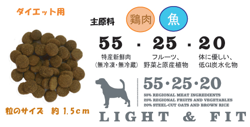 | 全犬種ダイエット用ドッグフード 太り気味の犬をベストの体重にするためには、引き締まった筋肉サポートと同時に食欲を満たすよう高たんぱくでありながら、体重コントロール出来るよう炭水化物量は控え、また皮膚の調子を整えるために適度な脂肪を含む食事が必要です。 引き締まった筋肉をサポートするために、アカナ ライト&フィットは地元草原農場産の放し飼い鶏肉と全卵、バンクーバー島の太平洋サーモンなど最高品質の肉原材料を成分の実に55%に使用しています。これらの原材料は毎日新鮮なまま(無冷凍・保存料不使用)自社工場に搬送されています。高たんぱく低炭水化物のアカナは犬の自然な食事を再現しています。消化疾患を引き起こす可能性がある小麦、トウモロコシ、グルテン一切不使用、その代わりとしてフルーツと野菜を使用しています。さらに、単糖(体重増加の原因となる)量が低い、低GI 炭水化物の蒸しアルバータオーツを使用しています。 新鮮太平洋サーモンに豊富に含まれるオメガ3(EPA とDHA)が免疫と健康な皮膚、輝く毛並み作りをサポートします。皮膚と毛並みは犬の健康と活力の外見的目安となります。さらにオーガニック海藻とジュニパーベリー、アンジェリカルート、レッドラズベリーリーフなどの草原植物に豊富に含まれるビタミン、ミネラル、微量元素、植物化学物質が代謝を増強化します。ワールドクラスのアカナはカナダ西部の最高品質の新鮮原材料を使用して、天候のよいカナダのアルバータ州にある家族経営の自社工場(受賞暦あり)で製造されています。原材料を読めばお分かり頂けるでしょう。アカナ ライト&フィットはあなたの犬がおいしく食べて健康でたくましく幸せに過ごすための自然ペットフードです。 代謝エネルギー3450 kcal/kg (250 ml カップ1 杯につき325 kcal )中45%がたんぱく質、20%が脂肪、35%が地元産フルーツ、野菜、蒸しオーツ由来です。 |