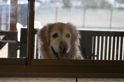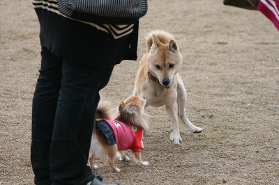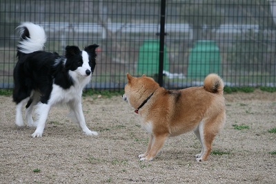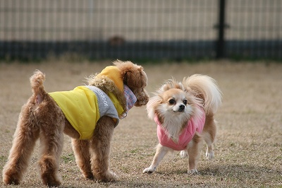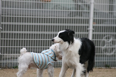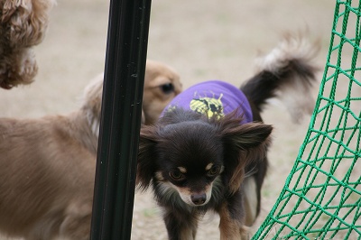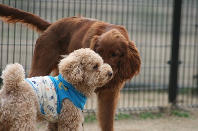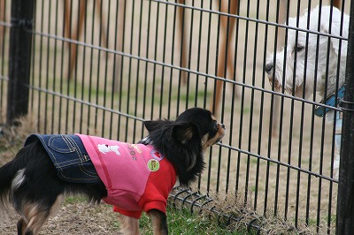 むにっとなってますよ(笑)フェンス越しにこんにちはーなマルコくんとモニカちゃん